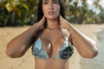 Elegant seamless triangle top, crystallized details on Cancer inspired design, drawstrings to tie at neck and back for an adjustable fit, high-quality Colombian lycra fabric, UPF 50+